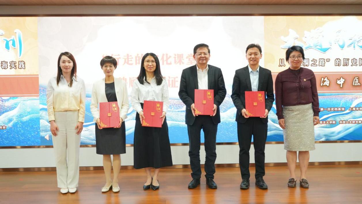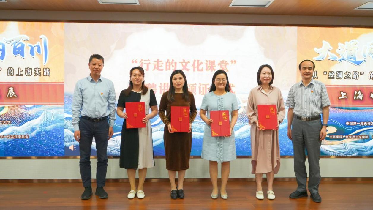 我校深耕“展览+宣讲”教育实践,打造“展教结合”文化育人实践基地。启动仪式上,与会嘉宾向大学生巡展讲解员颁发证书,并聘请上海市形势政策教育研究会会长沈明达、《宣传通讯》编辑部主任吕东卉、上海市档案馆档案利用服务部主任张斌、我校马克思主义学院院长王芳担任特聘顾问,聘任校馆双方多名专家作为首批特聘讲师。