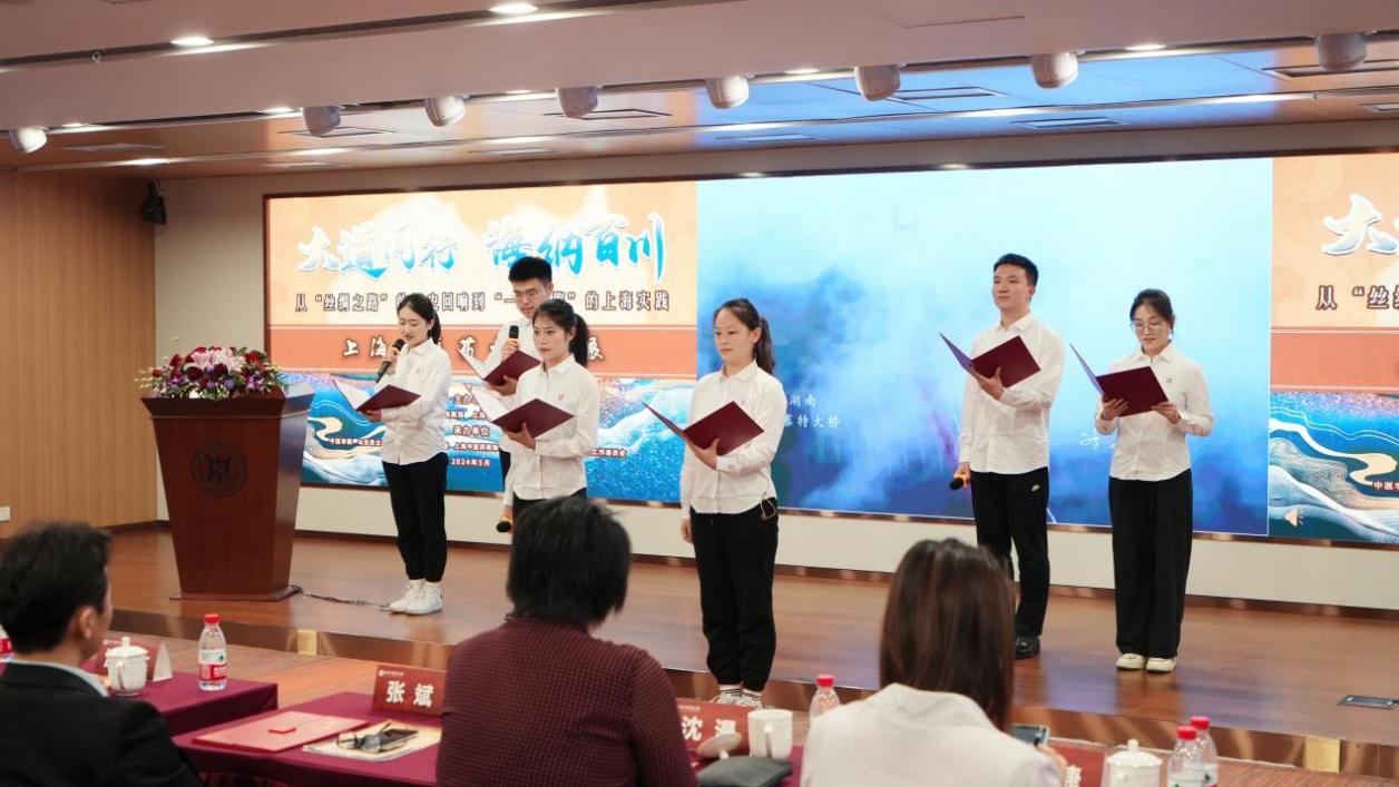 中医学院“生生”文化讲师团带来“文化强国新征程 中医青年勇担当”的现场朗诵,表达中医学子听党话、跟党走,努力传承精华、守正创新,弘扬中医药文化瑰宝的决心。“此次展览,我认为不仅是对‘丝绸之路’历史的一种传承,更是对‘一带一路’倡议的生动诠释。将‘大道同行,海纳百川’展览引进校园,对我们青年学生有深远的教育意义。”2022级中医学(屠呦呦班)贾炎枚说道。