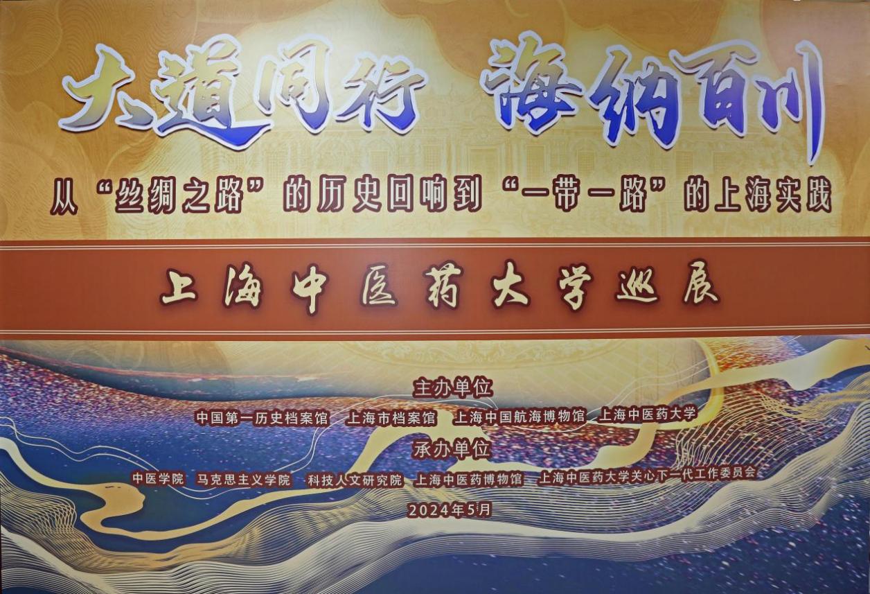 据悉,“大道同行 海纳百川——从‘丝绸之路’的历史回响到‘一带一路’的上海实践”档案文物展于202312月在上海市档案馆新馆正式对外展出。该展览由中央档案馆、国家档案局指导,由上海市档案馆、中国第一历史档案馆、中国航海博物馆共同举办。本次巡展通过“会通中外”“和合四方”“风气之先”“幸福之路”四大板块,运用250余件(组)档案、照片、文物,展示了绵亘万里、延续千年的古丝绸之路的灿烂文明,新时代共建“一带一路”的壮美画卷,以及上海作为“一带一路”桥头堡的十年硕果。该项目入选第23届上海市社会科学普及活动周项目。本次巡展将在我校8号教学楼四楼持续展出至9月,由中医学院组建的讲解员队伍为校内外师生提供“菜单式”“互动式”宣讲。