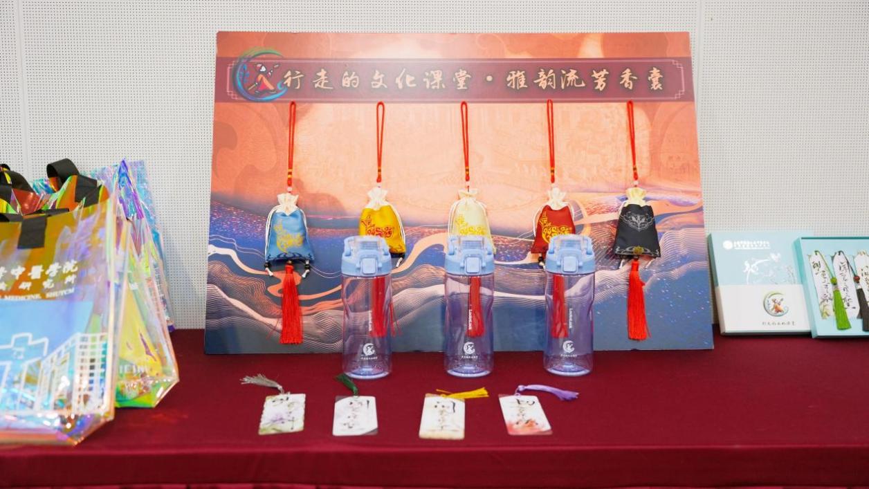 “行走的文化课堂”以展促创,以研发文创作品的方式,将文物的深度、历史的厚度、文明的广度融入中医药文化的“双创”行动。活动现场,一系列由学生团队研发的文创产品亮相。“行走的文化课堂”徽标生动描绘了一位书童右手持扇,左手点墨,行走在广袤的祖国大地上的特色形象。学生团队还延伸设计了带有徽标的水杯,体现中医望闻问切诊法思维的“四诊书签”,由上海市名中医、学校终身教授王庆其组方配伍的基于中医“五行学说”的“雅韵流芳香囊”等无不展现中医药文化的深邃雅致,在年轻一代中播下对中医药文化的热爱与传承的种子。
