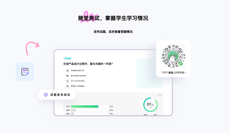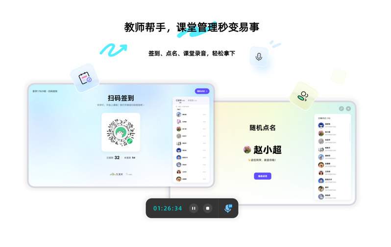 课堂助手:支持使用PPT插件选择课程与班级,并进行线上扫码签到和随机点名。开启录音后,可在课堂时光机中进行回顾。