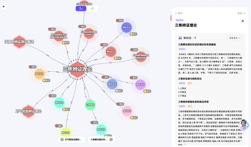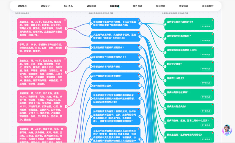 在《温病学》课程中,AI助教全程伴随学生学习,利用自然语言处理、深度学习和知识图谱技术提供个性化辅导。通过与知识图谱的智能交互,AI助教精准推荐学习资源,解答疑难问题,并根据学生的薄弱环节提供定制化支持。它通过多轮次智能问答帮助学生理解复杂概念,如温病的病因和发病机制等,确保学生在自己的节奏下获得实时指导。