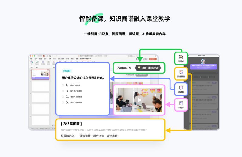 智能备课:通过PPT插件,可将课程知识图谱中的知识点、问题图谱、测试题一键引用到PPT中,同时支持AI搜索,海量教学资源任教师挑选。