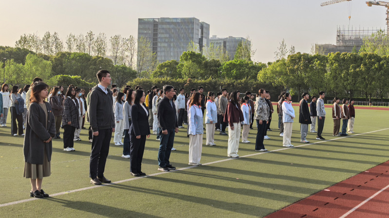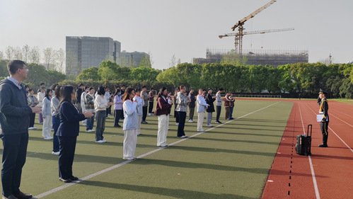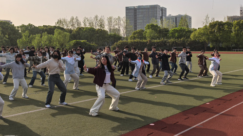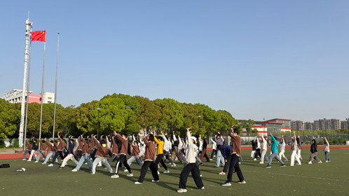 最后,周佳妮同学和俞玥同学带领同学们进行“闻鸡起武”训练。同学们在清晨的音乐声中舒展开来,以良好的姿态在阳光下共同演绎“八段锦”的刚柔并济之美,肢体的伸展与呼吸的吐纳相互协调,“左右开弓似射雕”展现出豪迈气魄,“两手托天理三焦”尽显舒展大方。师生们沉浸式感受着天人合一、阴阳平衡的传统智慧,以平和宁静的心态、饱满昂扬的精神,迎接接下来的生活与挑战。