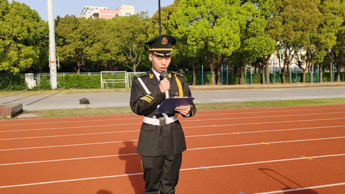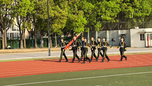 上午7时许,升旗仪式在庄严的国歌声中展开序幕。国旗护卫队的队员迈着整齐有力的步伐,护卫着国旗入场。随着国旗迎春风和朝阳缓缓升起,全体师生肃立,奏唱国歌。国旗在风中飘扬,心中的自豪感与崇敬之情也油然而生,随之翻涌。