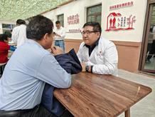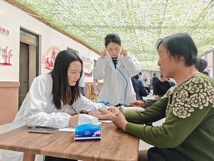中医学院由第四党支部吕仪老师带队,硕士生洪磊鑫和霍宇婷与海军第九〇五医院医疗队组成联合义诊队伍,在小院村助老大食堂搭建起“健康集市”。通过望、闻、问、切传统诊疗,为村民提供一对一个性化健康指导,对一些常见疾病和慢性病日常防治进行指导。针对老年人常见的慢性病问题,开展春夏养生健康讲座,传授中医养生功法,鼓励村民加强日常保健。志愿者们还为村民示范耳穴操,发放健康手册,发放降压药、感冒药等常用药品500余份。