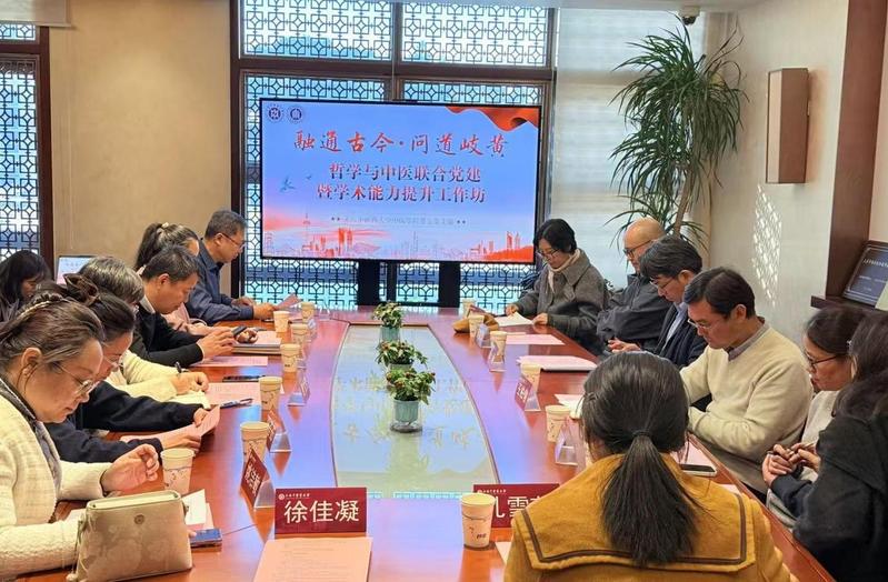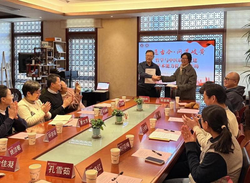 最后,两个支部共同举办了第一期“融通古今・问道岐黄”学术工作坊,与会教师围绕跨学科融合展开深入研讨。李海峰副院长提出,哲学为中医提供思维滋养,中医为哲学赋予实践载体,二者结合可实现修身与修心的辩证统一;姚洁敏教授期待以哲学智慧赋能中医药文化传承创新;华东师范大学朱承教授、郁振华教授分别从人工智能时代学科发展、医道与医术辩证关系等角度,阐述了跨学科合作的价值与路径。
