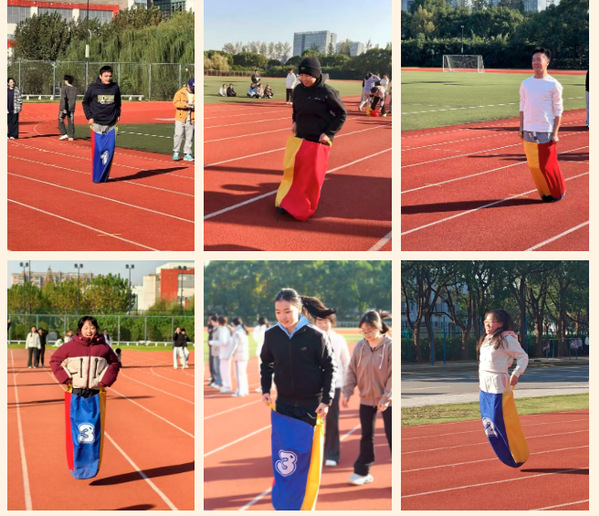 “袋鼠跳”赛场化为一片欢乐的海洋。同学们化身矫健的“袋鼠”,隐匿于彩色布袋之中,蓄力、起跳、落地、交接……每一次腾空都迸发着蓬勃朝气,每一程接力都传递着无限热情,将现场气氛推向沸点。