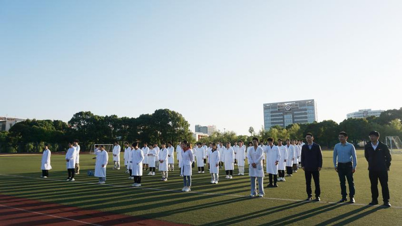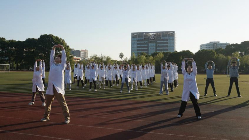 虎力老师讲述了党和政府对中医药事业的关怀,希望同学们“爱国明理、诵读经典、勤练内功,争做做新时代德智体美劳全面发展的新青年,争做守正创新、传承发展中医药事业的接班人。”全体教师学生在国旗下认真练习中医功法,传承弘扬中华优秀传统文化,展示出中医人的“精气神”。