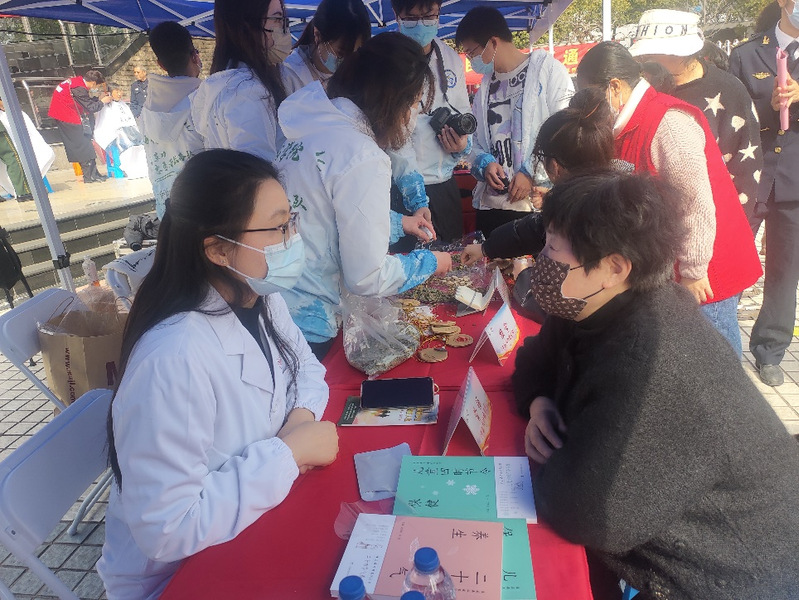 在活动开始前,就已经有一些叔叔阿姨坐在摊位前排队等待特色推拿服务,在对他们进行简单的问诊后,志愿者服务队同学们给每一位前来排队的人们进行推拿服务并进行健康宣教。