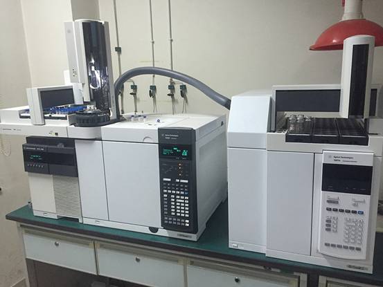 2、仪器介绍:Agilent 7890-5977型GC-MS,1)质谱部分:全扫描灵敏度(电子轰击源):1pg八氟萘,信/噪比>400︰1 (扫描范围:50-300amu),选择离子检测(电子轰击源):20fg八氟萘,信/噪比>10︰1;2)色谱部分:保留时间重现性<0.0008 min ;峰面积重现性<1%RSD等