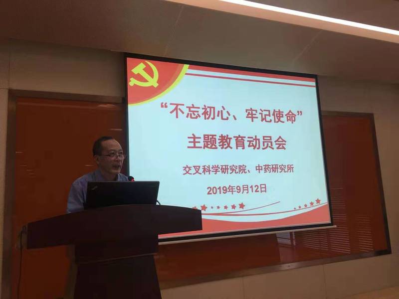9月12日下午,中药研究所、交叉科学研究院“不忘初心、牢记使命”主题教育动员会在5号楼5101会议室举行。校主题教育第一指导组组长陶建生同志作指导讲话,指导组成员周家伟同志出席会议。交叉科学院总支书记周强代表两个部门作动员讲话,所总支书记、副所长王广东代表研究所作表态发言。我所与交叉科学研究院领导班子、总支委员、支部书记参加会议。