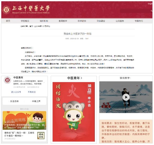 学生工作党总支发挥专业优势,认真研判疫情环境下学生思想状况,分析学生需求,适时通过媒体推出“一封信”“倡议书”“承诺书”等措施,通过“中医青年”公众号持续开展健康防疫知识宣讲,发动全校团员青年一起学做五禽戏,共同战“疫”。通过教育宣传,号召全体学生加强自我防护,做好假期规划,加强体育锻炼,减少社会活动,自觉落实防控要求,不提前返校,积极传播正能量。