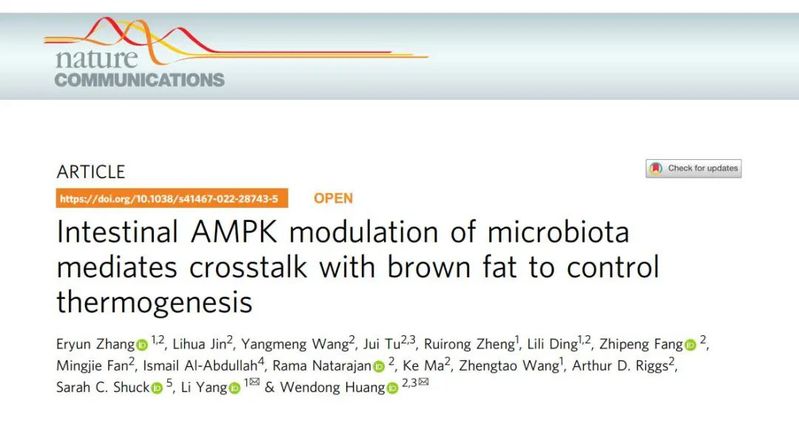 近日,我校杨莉研究员、王峥涛教授团队和美国希望之城国家医学中心黄文栋教授合作,在肠道营养传感器AMPK调节机体能量代谢机制研究方面取得重大进展,研究成果Intestinal AMPK modulation of microbiota mediates crosstalk with brown fat to control thermogenesis发表于《自然通讯》(Nature Communications)。