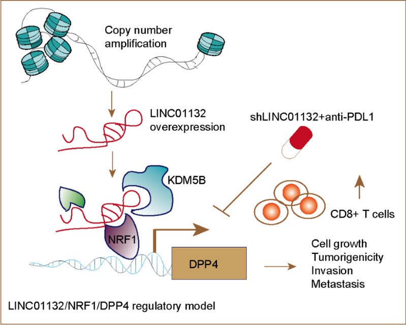 2022年9月,该团队联合海南医学院李永生教授团队在Journal of Experimental & Clinical Cancer Research发表题为Long noncoding RNA LINC01132 enhances immunosuppression and therapy resistance via NRF1/DPP4 axis in hepatocellular carcinoma研究论文,通过对lncRNAs全基因组表达模式的系统研究,发现LINC01132是肝细胞肝癌(HCC)中潜在的致癌基因,其在HCC中表达显著上调,与HCC患者的总生存率差相关。经研究发现,LINC01132可以与NRF1相互结合,同时增强DPP4的表达,发挥致癌的作用。值得注意的是,敲除LINC01132可诱导CD8+ T细胞浸润,敲除LINC01132联合PD-L1抗体治疗可提高PD-L1抗体对HCC敏感性,从而为肝癌联合治疗提供了新的策略。
