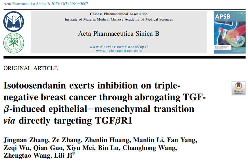 近日,我校中药研究所季莉莉研究员团队在Acta Pharmaceutica Sinica B发表题为Isotoosendanin exerts inhibition on triple-negative breast cancer through abrogating TGF-β-induced epithelial-mesenchymal transition via directly targeting TGFβR1的研究论文,揭示了中药川楝子中活性化合物异川楝素抑制三阴性乳腺癌转移的机制。