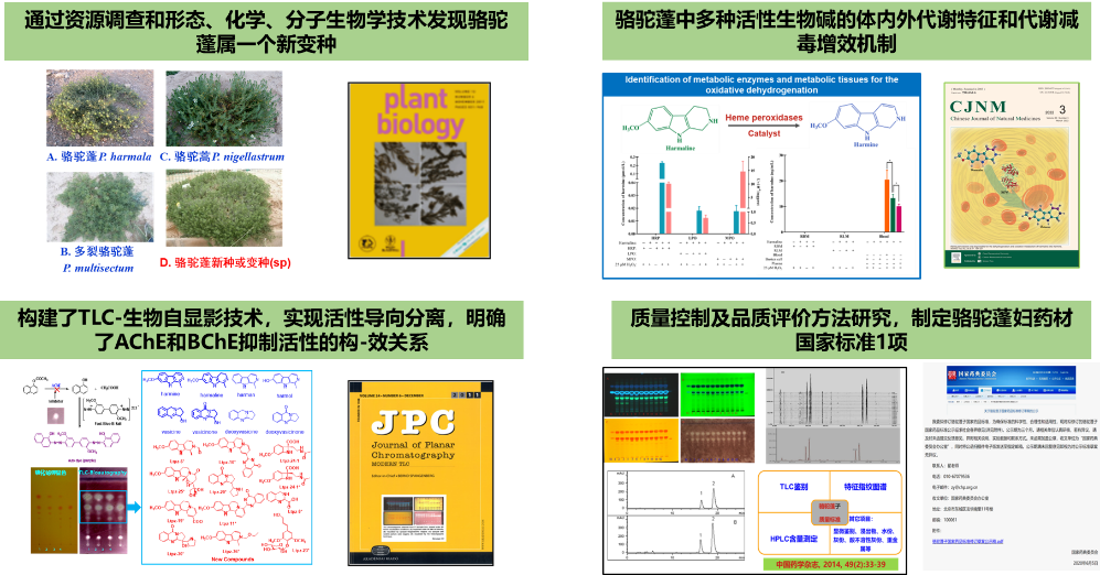 项目围绕特色骆驼蓬的药效物质基础和质量评价体系构建关键技术开展系统研究。首次对国内骆驼蓬属植物进行全面的资源调查,发现了一个新种或变种P. Variety,丰富了药材资源,建立了基于HPLC特征指纹图谱的化学计量学分类法,从形态学、化学、分子生物学层面对骆驼蓬属进行分类研究,通过分子生物学技术确证P. variety为一个独立的新种或变种;构建了快速、直观的TLC-生物自显影技术,实现了活性导向的骆驼蓬活性生物碱的分离纯化,明确了选择性抑制AChE和BChE的构-效关系,并证明生物碱为其抗老年痴呆、止咳祛痰平喘、抗炎镇痛的主要药效成分;阐明了多种成分的体内外代谢特征和代谢减毒增效机制,明确了量-时-毒-效关系,揭示了总生物碱的毒性耐受性机制和安全范围;明确了骆驼蓬在复方木尼孜其颗粒中发挥抗痛经和抗肿瘤的药效物质基础和作用机制,提升了制剂的科技内涵;首次将真伪鉴别和活性评价相结合的TLC-生物自显影技术应用于民族药的品质评价,构建了质量标准体系。骆驼蓬子国家药品标准此前通过国家药典委公示。骆驼蓬子、香青兰子和复方木尼孜其颗粒等3项企业标准的建立,提升了药材及制剂的质量控制水平。