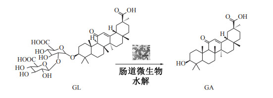 甘草片的特殊“苦味”来源于甘草中的甘草酸(Glycyrrhizin,GL),即β-嘧啶型三萜皂甙,又称甘草甜素,是一种高甜度、低热量的有效活性成分,常被作为甜味剂用于食品、饮料、烟草等行业,可以给产品增加甜味和香味。甘草酸可以添加在酱油、酱菜中调味,也可以应用于糕点的制备,具有疏松、增泡及软化作用。GL是甘草甜味的主要来源,并且甘草的药理学性质也主要归因于GL。甘草酸的口服利用度并不高,仅为4%。口服的甘草酸可在消化管道内被肠道细菌分解成甘草次酸(Glycyrrhetinic Acid,GA,GL的糖苷配基部分)被吸收,甘草次酸的生物利用度高达90%,是甘草酸在体内吸收入血并发挥药效的主要形式。