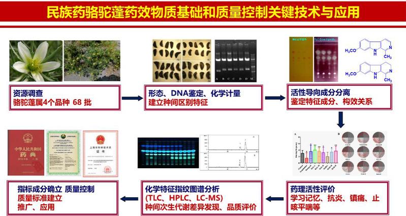 该项目围绕特色民族药骆驼蓬药效物质基础和质量评价体系构建关键技术开展系统研究。对国内骆驼蓬属植物进行全面的资源调查,采用形态学、化学计量学、分子生物学技术确证P. variety为一个独立的新种或变种,丰富了骆驼蓬属植物资源;构建了TLC-生物自显影技术,实现了活性成分导向分离;证明了骆驼蓬生物碱为抗AD、止咳平喘、抗炎镇痛的主要药效成分,并明确了AChE抑制活性构-效关系;阐明了多种成分的体内外代谢特征和代谢减毒增效机制及量-时-毒-效关系;明确了骆驼蓬在复方木尼孜其颗粒中发挥抗痛经和抗肿瘤的药效物质基础和作用机制,提升了制剂的科技内涵。成果获授权专利5件,发表论文91篇,其中SCI收录48篇,建立国家药品标准1项、企业标准3项,提升了药材及制剂的质量控制水平。整体成果推广应用后,助力复方木尼孜其颗粒成为新疆首个销售过亿的大品种,先后获得中药大品种科技竞争力排行榜上榜品种、国家二级中药保护品种,乌兹别克斯坦进口注册许可,促进了民族药国际化。推广应用取得了满意的社会和经济效益。