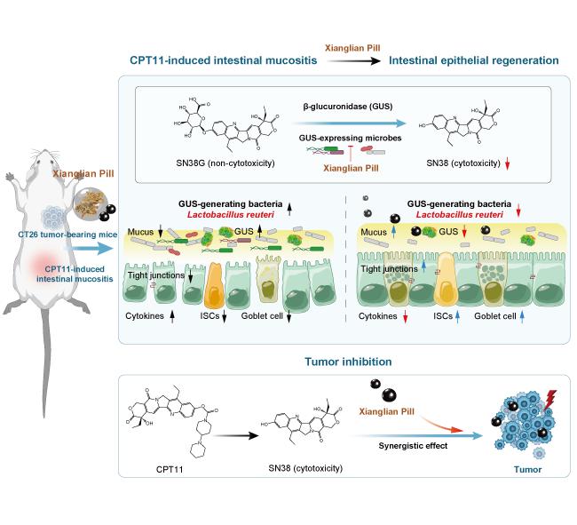 近日,我校中药研究所窦薇研究员、王峥涛教授、陈凯先院士,肝病研究所刘成海教授团队在Advanced Science发表题为ß-Glucuronidase-Expressing Lactobacillus reuteri Triggers Irinotecan Enterotoxicity Through Depleting the Regenerative Epithelial Stem/Progenitor Pool的研究论文,揭示了表达β-葡萄糖醛酸酶(GUS)的肠道微生物Lactobacillus reuteri是促发肿瘤化疗药伊利替康引起肠黏膜损伤和肠道隐窝干细胞池耗竭的主要因素,中医治下痢名方香连丸通过抑制L. reuteri而促进黏膜屏障修复从而减轻化疗肠毒性的作用机制,提出精准调控肠道微生物群在管理化疗所致胃肠道副反应中的治疗潜力。