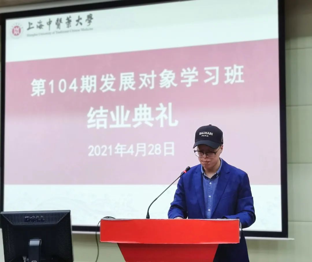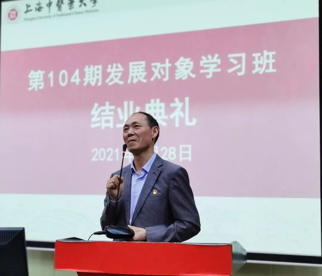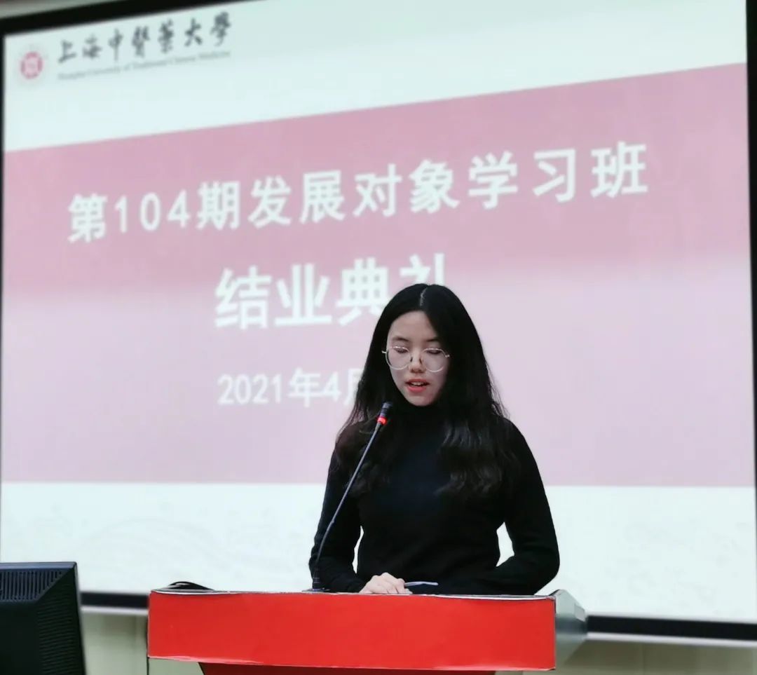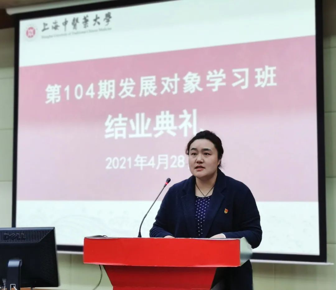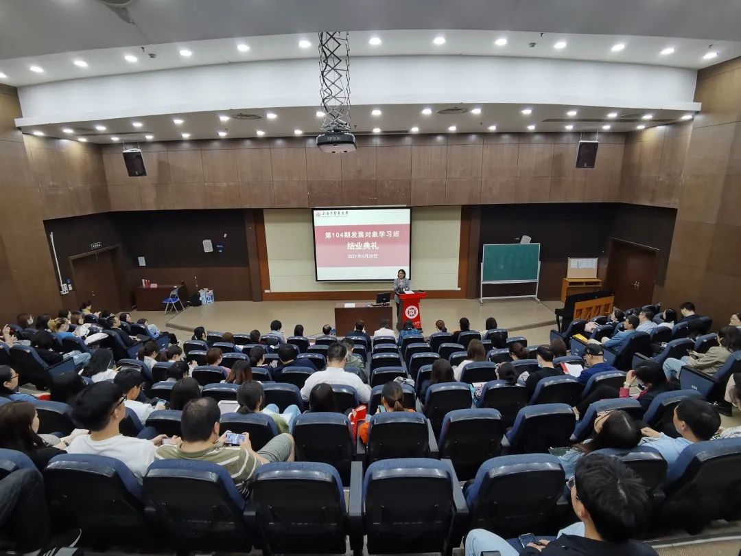 4月28日下午,校第104期发展对象培训班结业典礼在6504举行。校组织(统战、党校)副部长严月华、校组织部组织员千英信、护理学院党总支书记史美育、中药学院党委副书记沈漫、公共健康学院党总支副书记干旦峰及培训班班主任、指导老师等出席会议。会议由培训班班主任、中药学院组织员何丹丹主持。