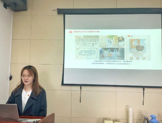 会议伊始,教工第一党支部书记倪梁红与第二学生党支部书记王盼就支部的工作思路、工作概况及建设特色进行了分享。倪梁红同志以“立德树人守初心,勇攀高峰担使命”为主题,阐述了教工第一党支部以“立德树人”、“教书育人”作为建设理念,充分发挥教工党员的专业理论知识与实验技能优势,帮助学生在学业、科研和实践等方面成长,坚持服务健康中国战略,助力医药产业发展。王盼同志以“强化支部建设,做实服务引领”为主题,介绍了第二学生党支部根据党员队伍年轻化特点和生活园区需求,以学生生活、学业与发展需求为出发点,充分发挥支部优势,坚持落实与完善园区与楼宇建设,通过各类“药行动”办实事活动,服务学生群体需求,提升支部的组织力与战斗力。