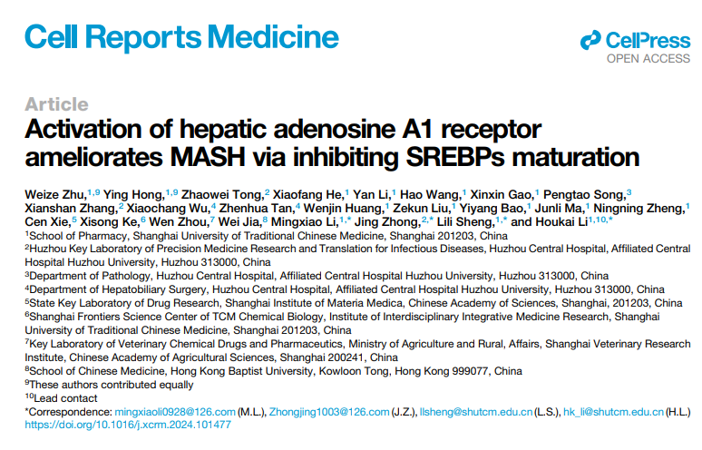近期,我院李后开教授团队联合浙江大学医学院附属湖州医院在Cell Reports Medicine发表了题为Activation of hepatic adenosine A1 receptor ameliorates MASH via inhibiting SREBPs maturation的研究论文,证实肝脏腺苷A1受体(A1R)是治疗代谢相关性脂肪性肝炎(MASH)的潜在新靶标,并阐释了相关机制,获得了靶向激活肝脏A1R治疗MASH候选中药小分子化合物。