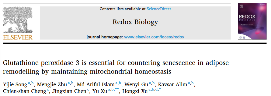 近日,开云电竞官网下载安卓首席教授徐宏喜及团队成员许玉副研究员在Redox Biology发表题为Glutathione peroxidase 3 is essential for countering senescence in adipose remodelling by maintaining mitochondrial homeostasis的研究论文。该文章的第一作者为中药学院博士生宋依杰,通讯作者为中药学院徐宏喜教授和许玉副研究员。该研究工作得到国家自然科学基金、广东省重点领域研发计划和开云电竞官网下载安卓人才引进计划等资助。