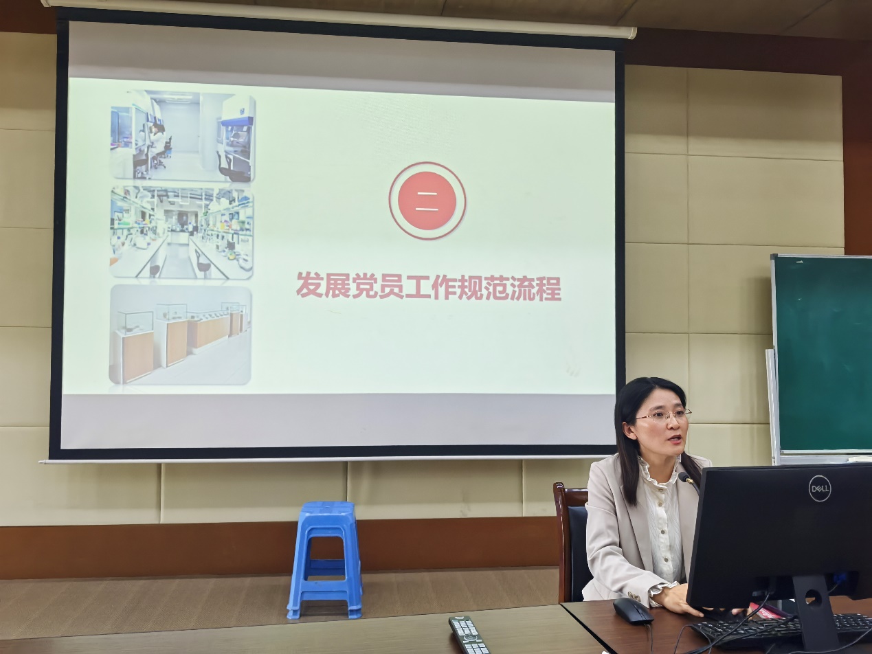 何丹丹介绍了党组织对于党员发展工作程序的规范和四个严格标准,坚持将高质量贯穿于党员发展工作全过程,并指出身为党员应当发挥充分的先锋模范作用。