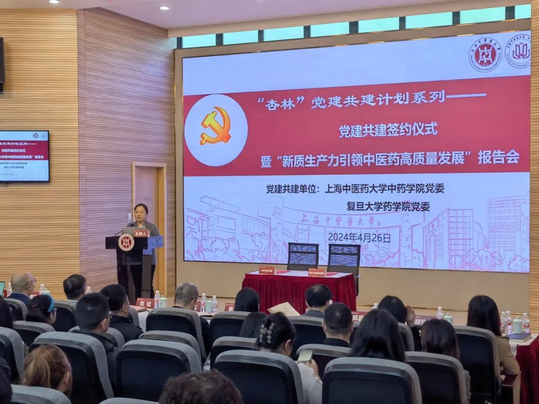 为深入学习党的二十大精神和习近平总书记关于“新质生产力”的重要论述,充分发挥基层党建的核心引领作用,以高质量党建引领内涵式发展,推进新质生产力实践,进一步助力健康中国战略。4月26日,我院党委与复旦大学药学院在全球合作伙伴中心一楼报告厅开展党建共建签约仪式暨“新质生产力引领中医药高质量发展”报告会。我校党委副书记周斌出席本次会议,复旦大学药学院党委书记王建新、副书记史雪茹和王盛,我院党委书记沈岚、院长张彤、副书记陆婧、副院长郑昌武和胡凯莉以及双方师生党员等共计100余人参加。会议由我院党委书记沈岚主持。