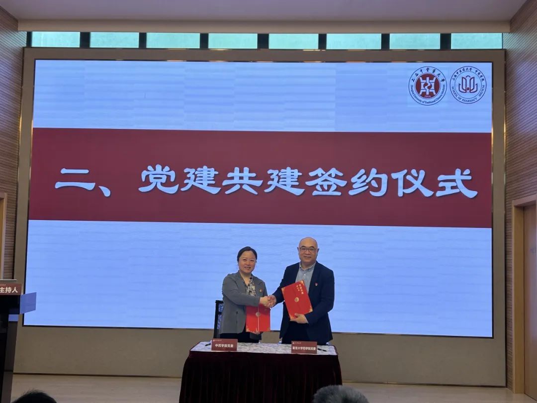 接着,双方进行了党建共建签约仪式。我院党委书记沈岚与复旦大学药学院党委书记王建新共同签署党建共建协议书。旨在把党建引领转化为新发展动能,构建资源互通、组织互联、功能互补的基层党建格局,实现合作共赢。