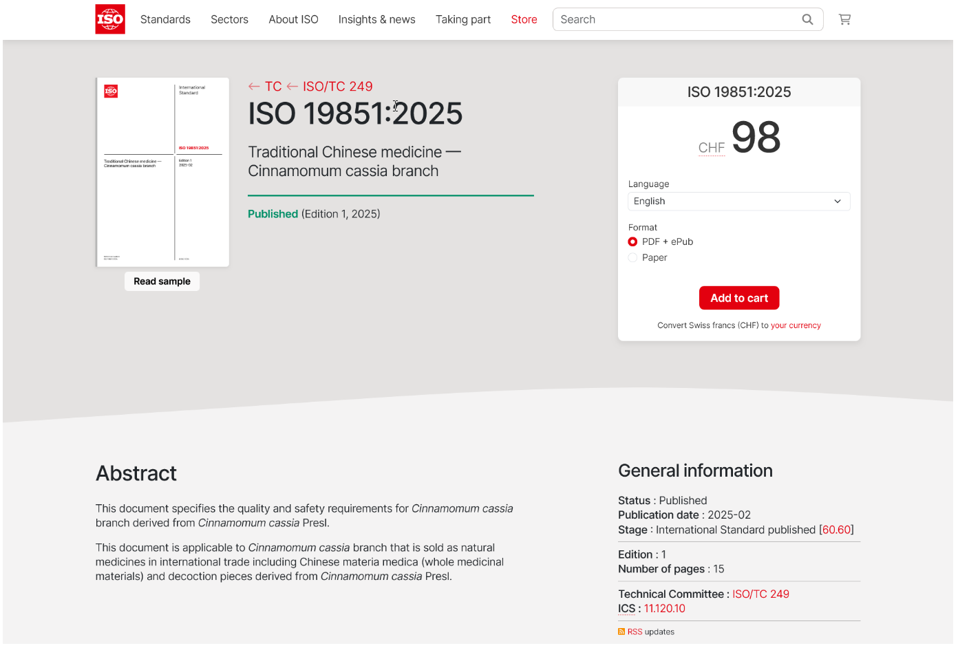 ISO19851: 2025 Traditional Chinese medicine — Cinnamomum cassia branch《中医药—桂枝》国际标准由国际标准化组织(ISO)近期正式发布,这是我院张彤教授研究团队主导制定与发布的大宗中药材ISO国际标准。