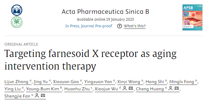 近日,我院范圣洁、黄诚与中药研究所吴晓俊组在Acta Pharmaceutica Sinica B发表了题为Targeting farnesoid X receptor as aging intervention therapy的研究成果,揭示靶向核受体FXR抗衰老机制。