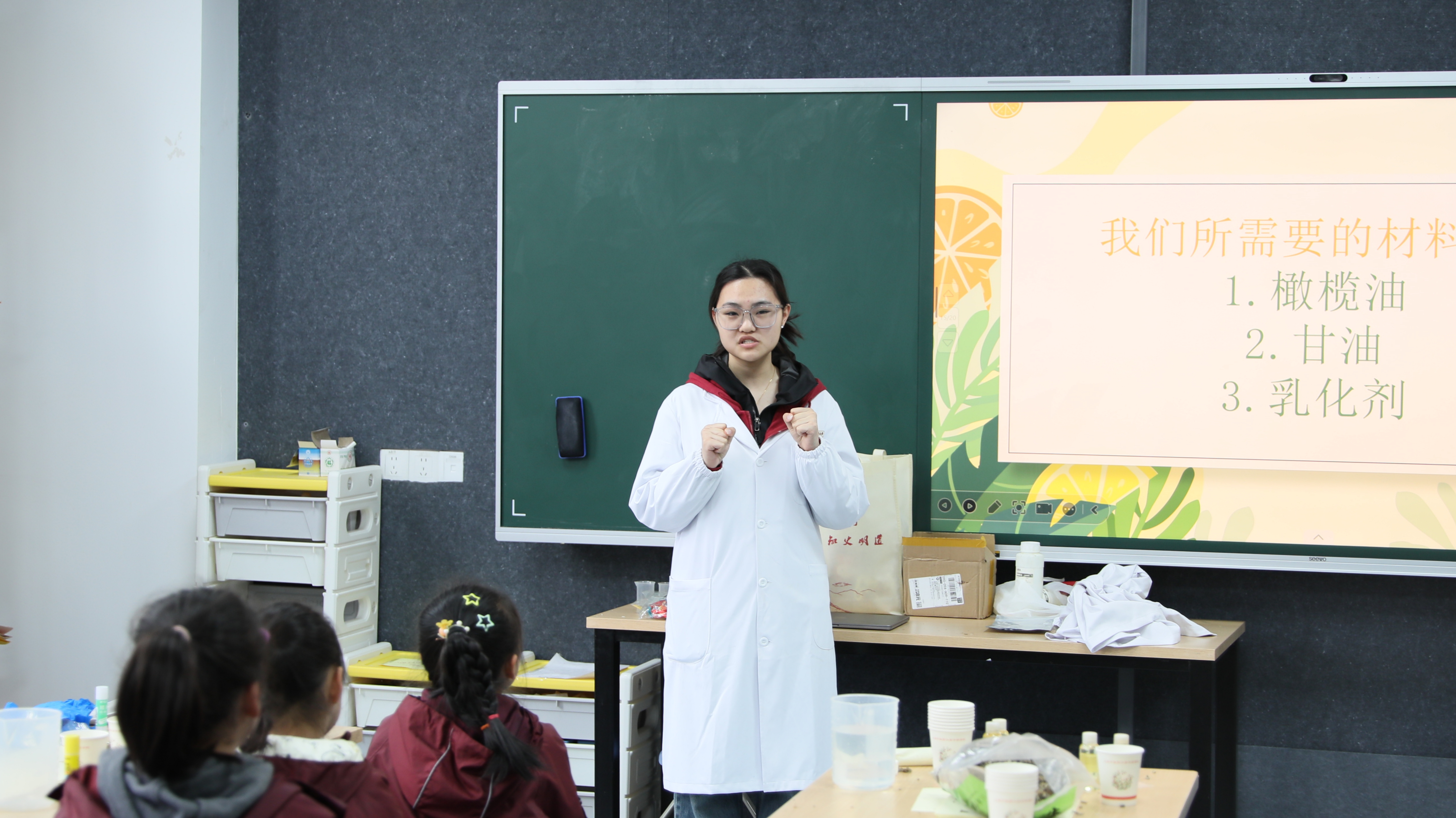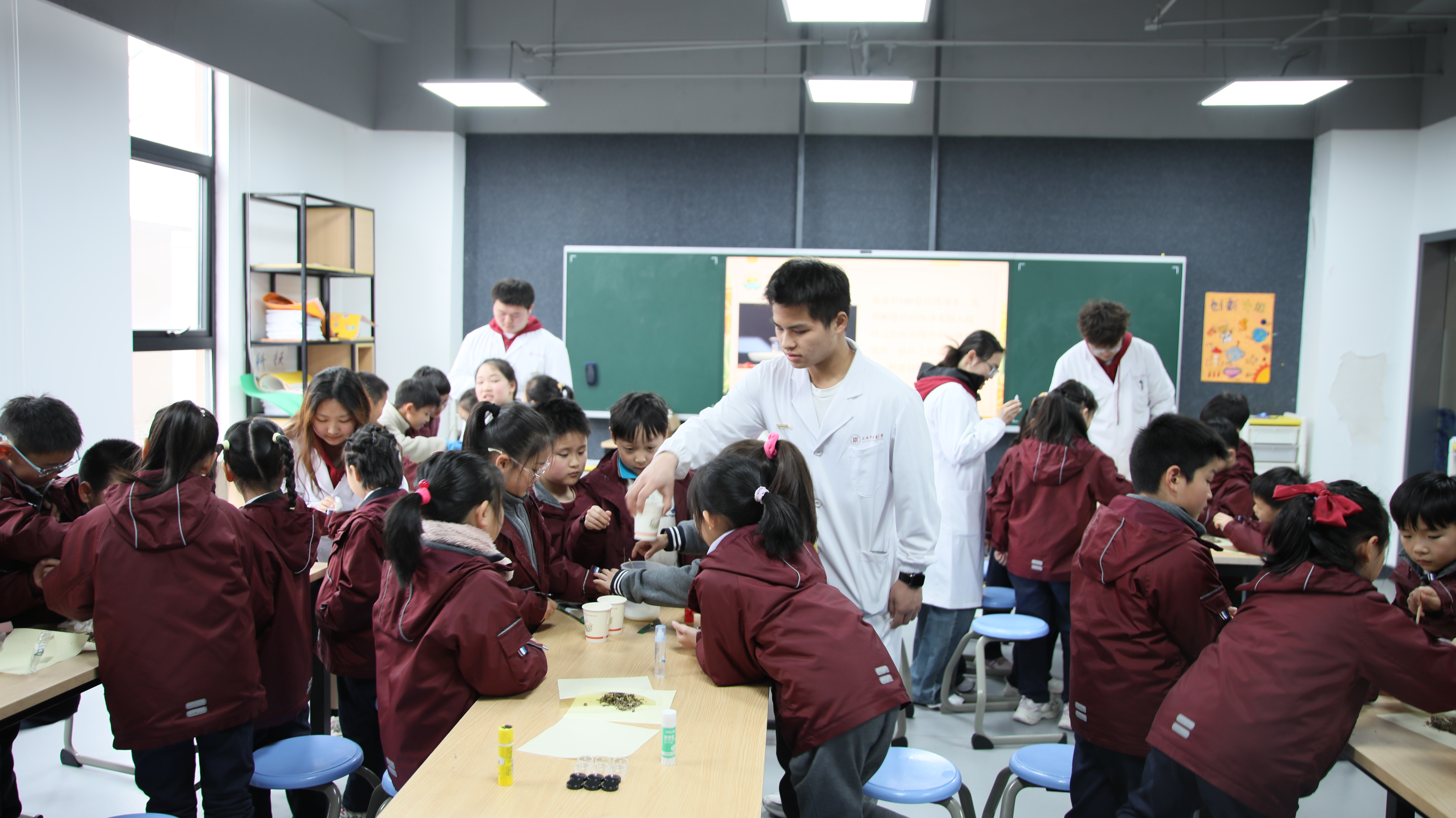 活动的最后环节,创新班的同学们带领小学生们分组进行了中医药小实验,制作了艾灸棒和护手霜。小学生们积极参与,亲手体验了中医药的奇妙之处。通过小组合作与交流,小学生们不仅学到了中医药知识,培养了团队合作精神和科学探究能力。