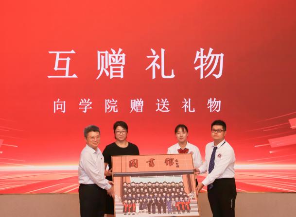 随后,我院党委书记车荣华、院长张彤将象征启航、美好与幸福的礼物赠予毕业生,祝愿每一位毕业生带着学校、学院的印记,自信从容地走向未来。同时,学生代表也向学院献上了承载着感激与祝福的礼物——一幅画有毕业生们以及学院领导老师专属卡通形象的画作。这份礼物传递着情感,温暖着心灵,见证了师生间的深厚情谊与难忘时刻,表达了毕业生们的心永远和学院在一起的美好心愿。