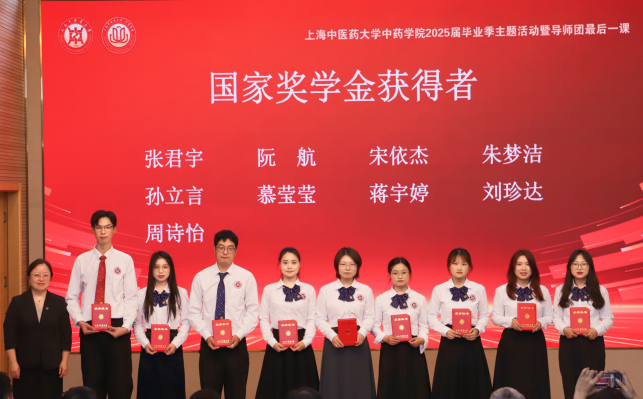 随着现场气氛愈发热烈,典礼进入宣读优秀毕业生名单及颁奖环节。由我院院长、厚德弘药导师团团长张彤宣读获奖名单,活动到场嘉宾依次为荣获国家奖学金、上海市优秀毕业、校优秀毕业生以及建国奖学金的优秀毕业生们颁发荣誉证书。那些曾挑灯夜战、埋头苦读的日子,在这一刻都化作了最荣耀的勋章,激励着他们未来继续前行。