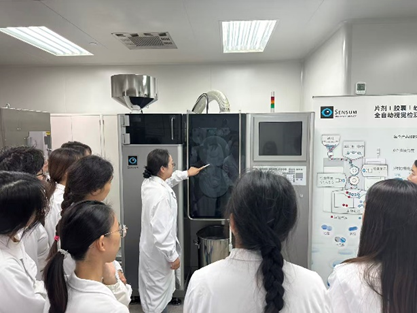 在亚什兰上海医药技术中心,老师首先介绍了亚什兰公司的发展历史与公司文化。接着,同学们依次近距离参观了湿法制粒机、多功能流化床、包衣机、热熔挤出等仪器的原理与使用方式,了解了不同辅料在不同制剂中的应用,并了解到药品包装的当看到课本上的原理化作眼前高效运转的精密机器,当亲手启动设备完成一道道工序,同学们真切感受到了理论与现实之间的连接点,对中药制剂生产的严谨性、复杂性与先进性有了前所未有的深刻体会。